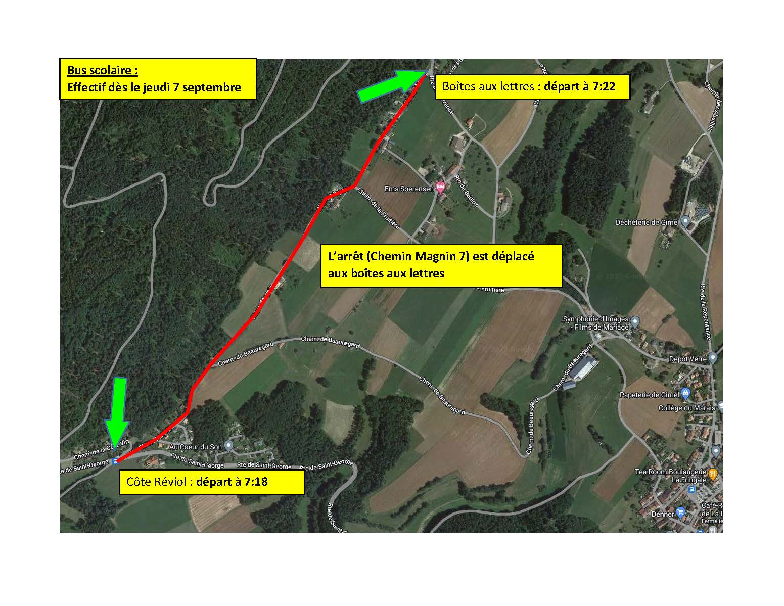 Nous vous remercions de prendre note du tracé du bus pendant les travaux (voir l’illustration ci-dessous), dès le jeudi 7 septembre. Nous attirons votre attention sur le déplacement de l’arrêt “Chemin de Magnin 7” aux “Boîtes aux lettres” et aux horaires affichés: